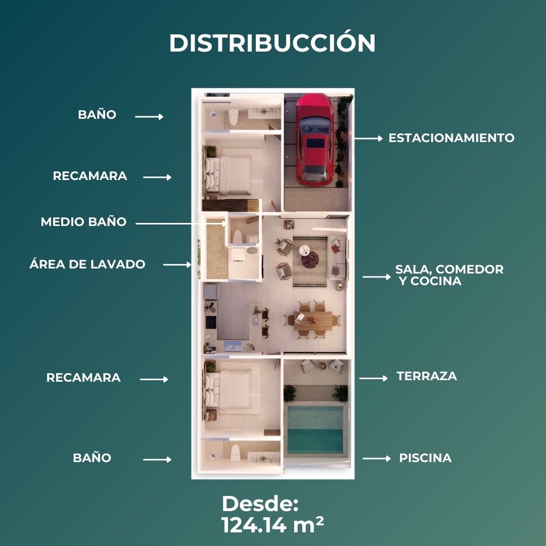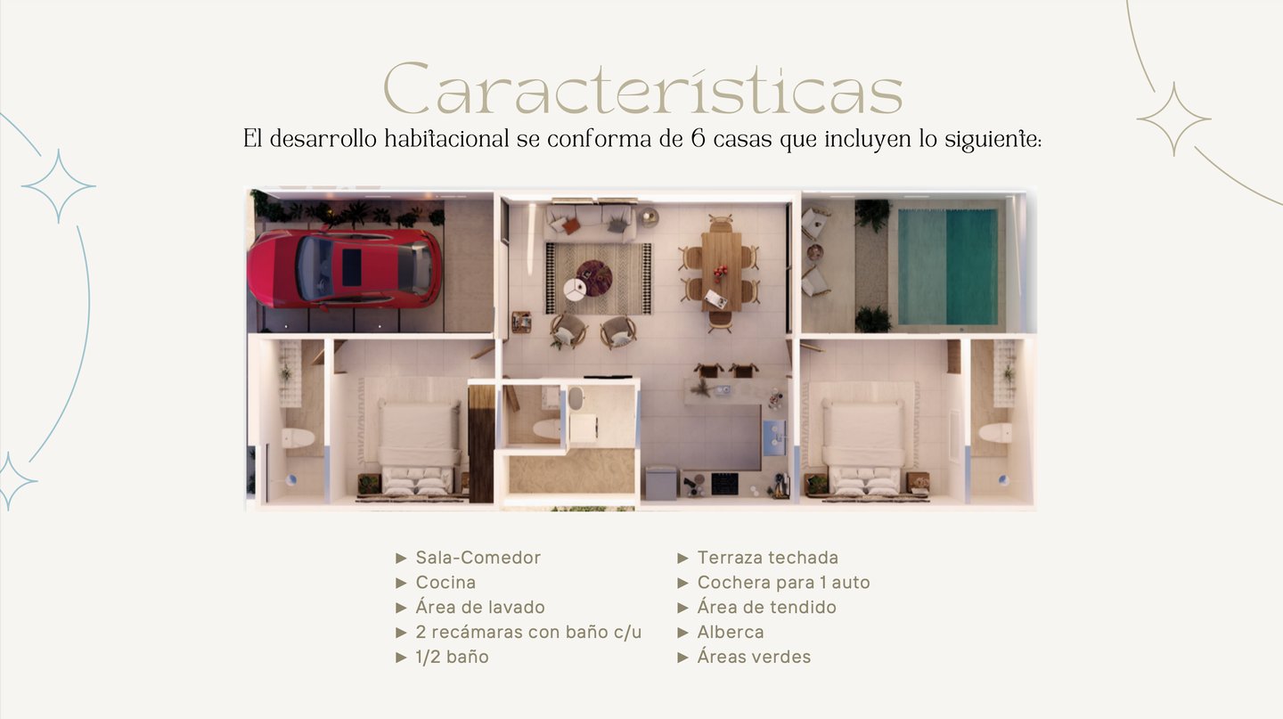 Cada casa cuenta con sala-comedor, cocina, área de lavado, 2 recámaras con baño propio, medio baño de visitas, terraza techada, alberca, jardín, área de tendido y cochera.