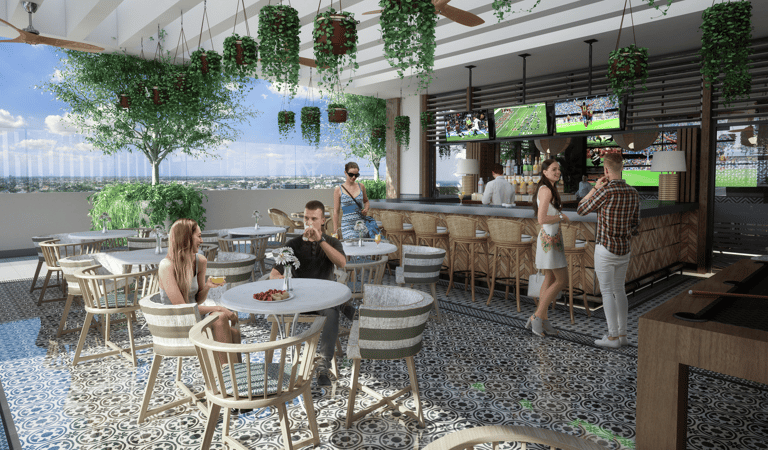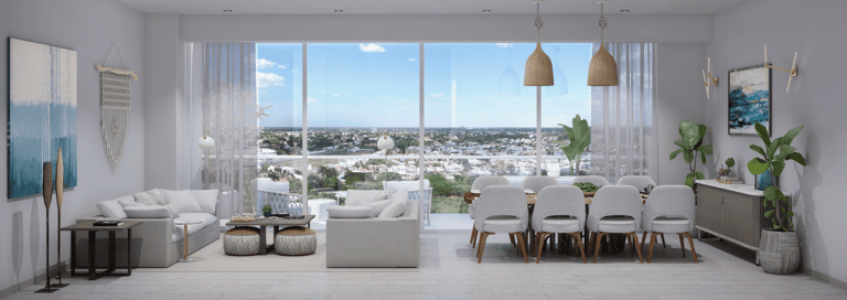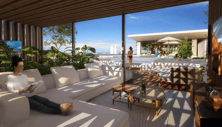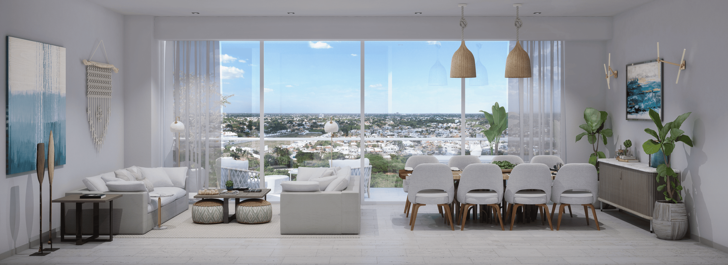 Vistas privilegiadas, albercas exteriores e interiores, sports bar y áreas de descanso en altura. Departamentos con terrazas privadas, cocinas italianas con granito, closets y baños de lujo.